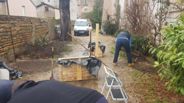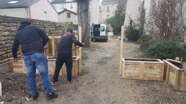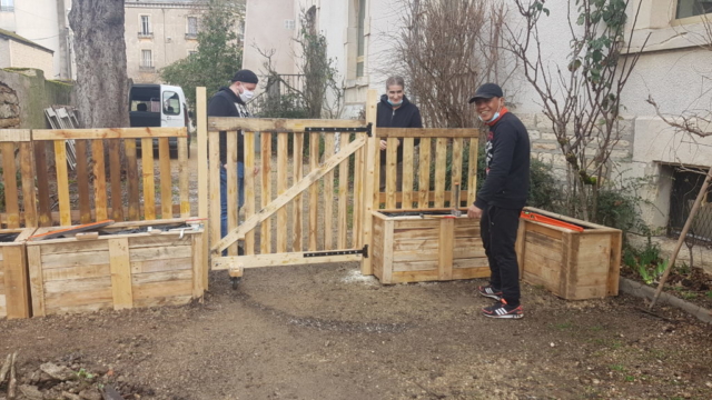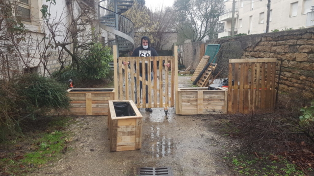 Afin de préparer au mieux le futur lieu collectif des Pensions de Famille, l’Espace Permanent d’Insertion a réalisé des jardinières accolées à des barrières ainsi qu’un portillon en palette.