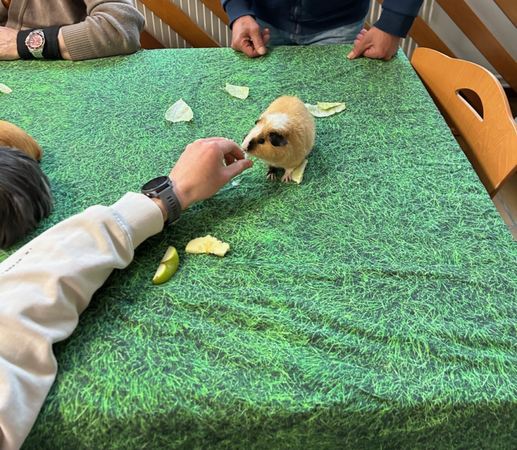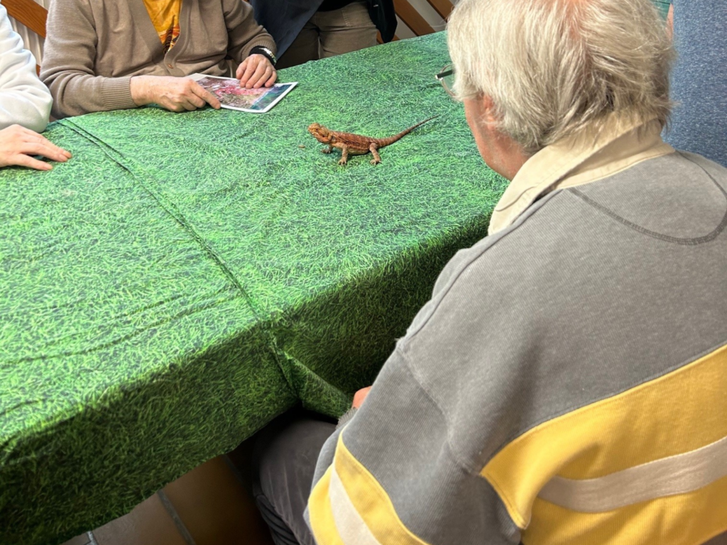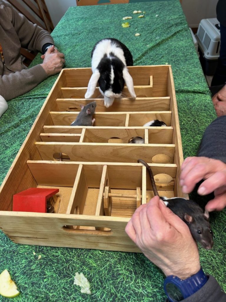 Les résidents ont pu prendre dans leur main un lézard, nourrir des lapins, des cochons d’Inde et des Chinchillas, observer les rats sortir d’un labyrinthe et nourrir les poules qui se promenaient sur la table.