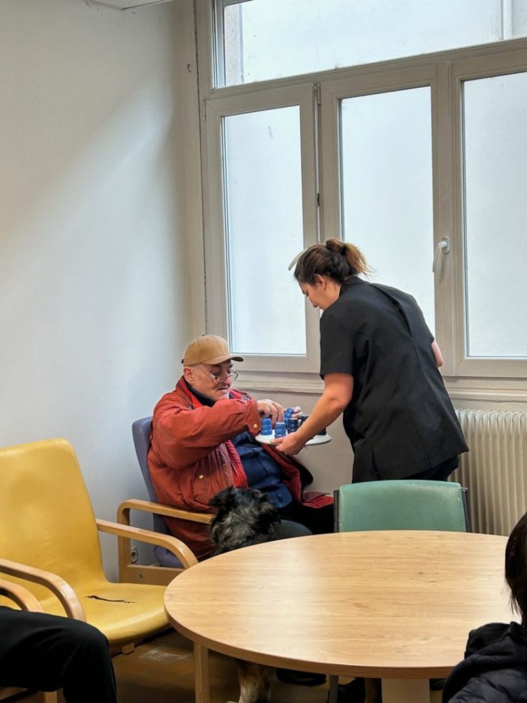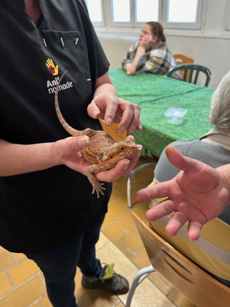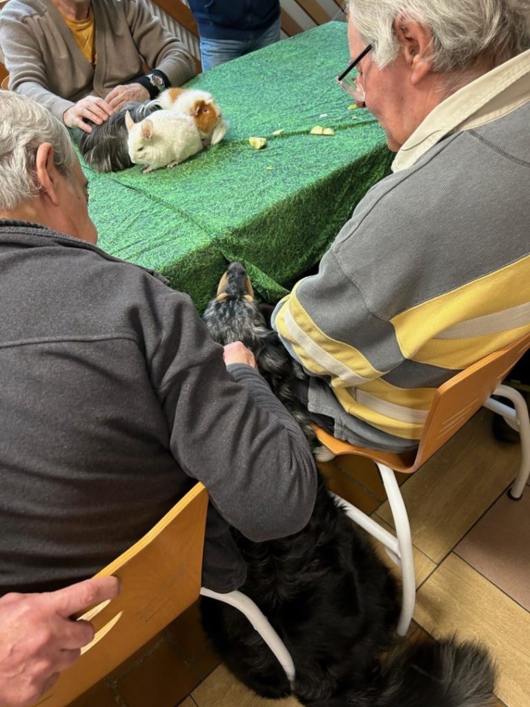 Ce mardi 12 mars, 15 résidents du foyer se sont réunis autour des animaux de l’association pour un moment de partage, de douceur et de caresses.