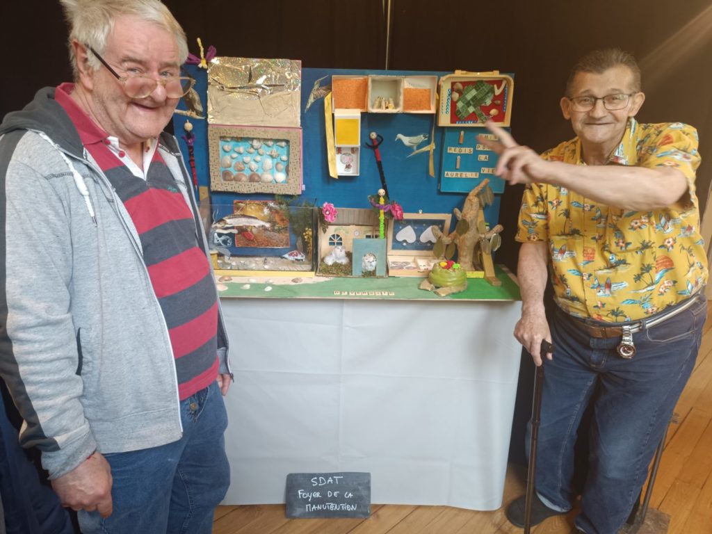 À l’occasion du vernissage, Chantal, Jean-Pierre, Bernard, Régis, Jean, Christian, résidents du foyer de la Manutention ont pu découvrir leurs propres œuvres intégrées dans cette singulière muséographie, œuvres créées à l’occasion des ateliers d’Art Thérapie au foyer de la Manutention et ce, sous la houlette de Maud, art-thérapeute.