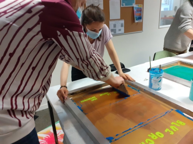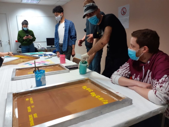 Dans un premier temps, l’association Le Tache Papier est venue dans nos locaux afin de réaliser 25 affiches sérigraphiées qui ont été affichées dans les locaux de SDAT-entreprise pour annoncer ce concert. Sept bénéficiaires ont participé à cet atelier d’initiation et de découverte.