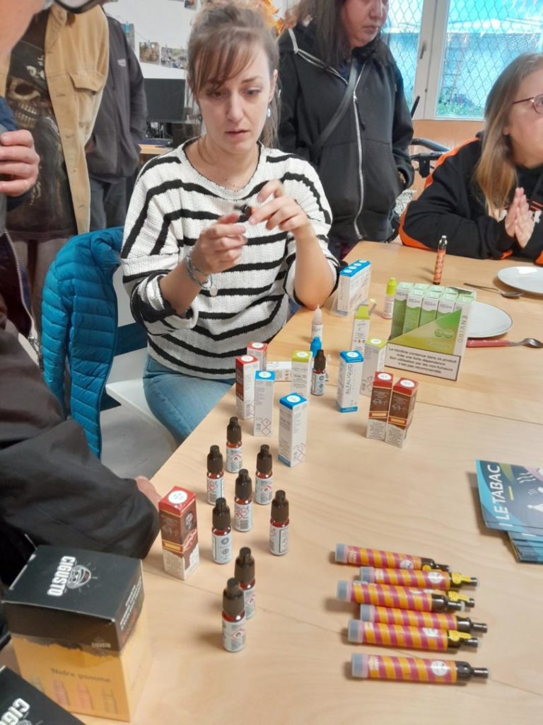 C’est dans la bonne humeur que cet atelier, qui a su rassembler environ 25 des personnes accompagnées autour de délicieuses crêpes préparées par les pensionnaires, a pu donner à chacun l’occasion de découvrir, toucher, goûter, et même de ramener gratuitement chez soi des modèles de cigarettes électroniques et de e-liquides.