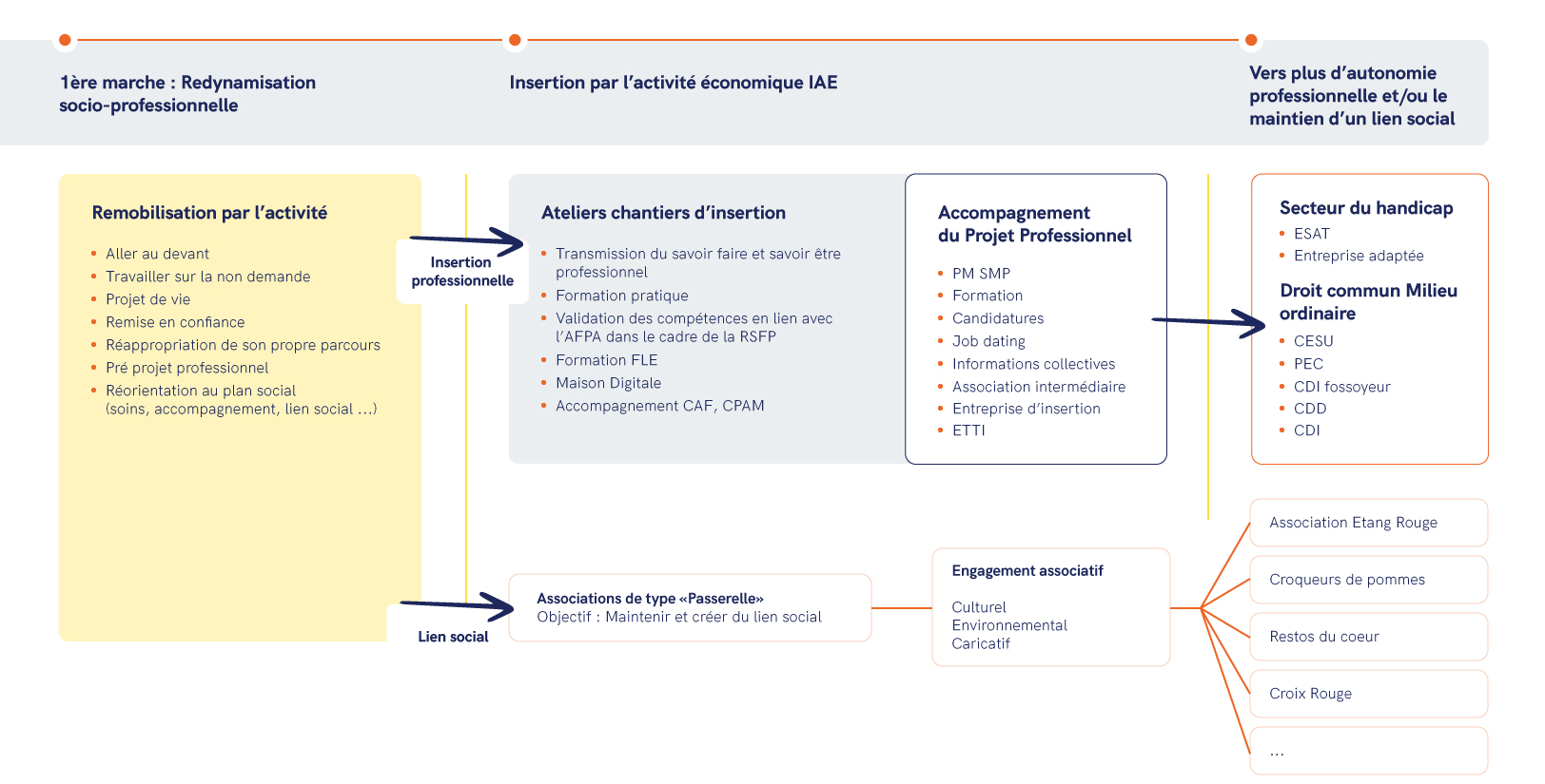 Ces différents dispositifs permettent de créer un parcours d’insertion sociale et professionnelle individualisé pour permettre l’inclusion des personnes très éloignées de l’emploi. L’articulation entre la politique d’insertion du conseil départemental et la politique publique de l’emploi permet de regrouper deux phases distinctes mais complémentaires et surtout indispensables à la construction des parcours singuliers.