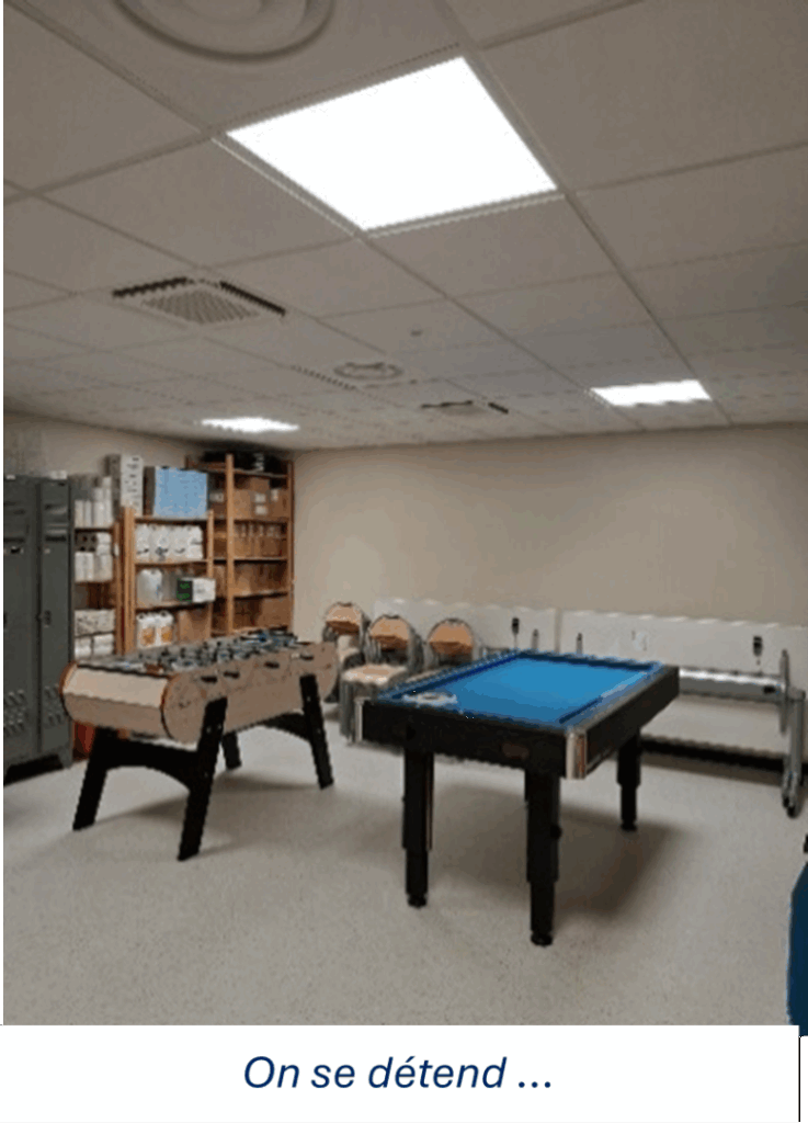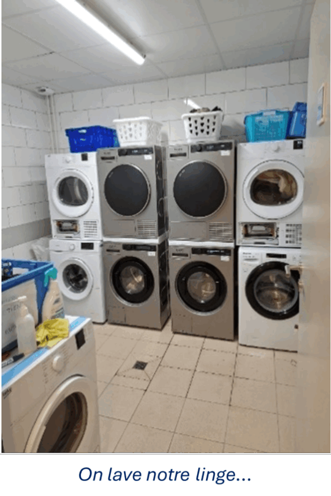Ce bâtiment plus grand imaginé par le cabinet d’architecture Tabula Rasa (450 mètres carrés), écoconçu (isolé avec un matériau biosourcé, le bloc de chaux-chanvre), climatisé, dispose d’espaces plus agréables et adaptés (réfectoire d’une trentaine de places assises, salles de convivialité, cuisine, bagagerie, dressing). Mais aussi d’une salle d’activités avec baby-foot et billard, et d’un espace détente permettant aux personnes en rue de dormir sur des lits de camp.[…]