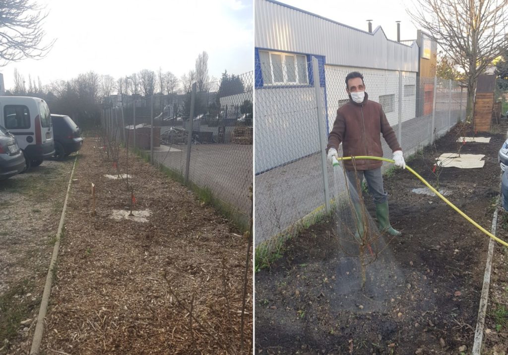 Nous avons planté les arbres avec les participants de l’atelier, puis nos partenaires des Restos du Cœur nous ont offert du mulch afin de pailler les arbres.