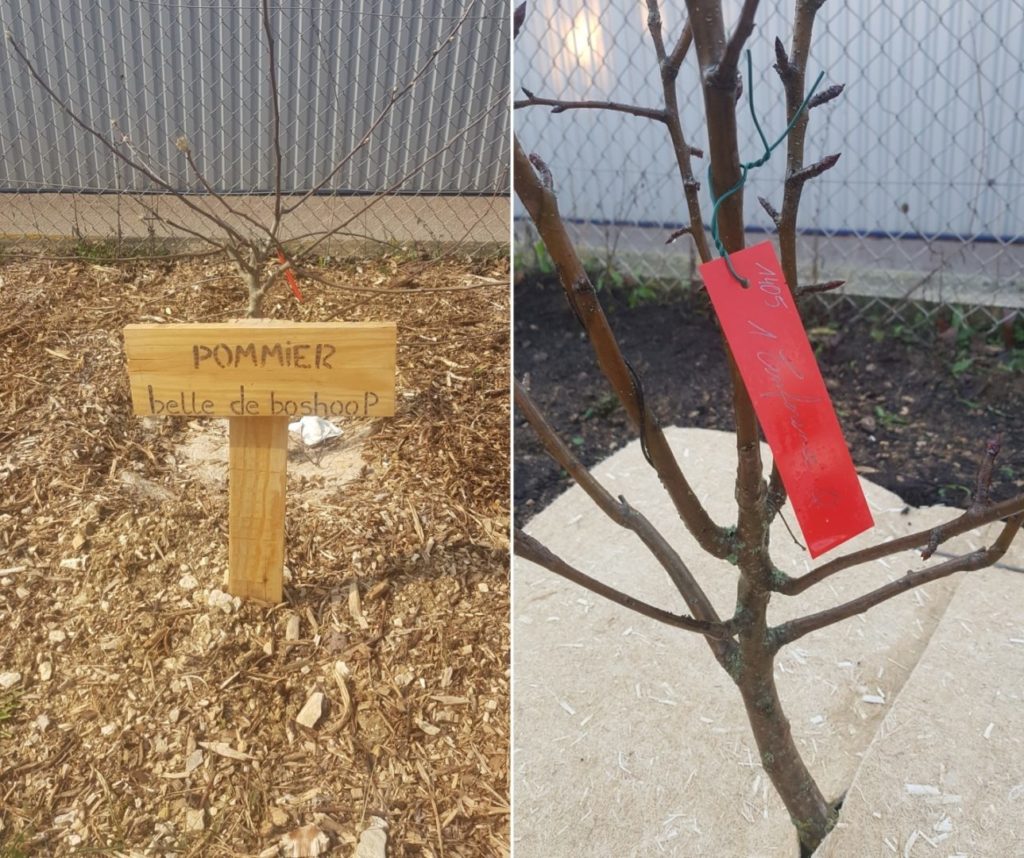 Nous avons réalisé le pyrograve des pancartes afin d’indiquer l’espèce et la variété des différents arbres et arbustes.